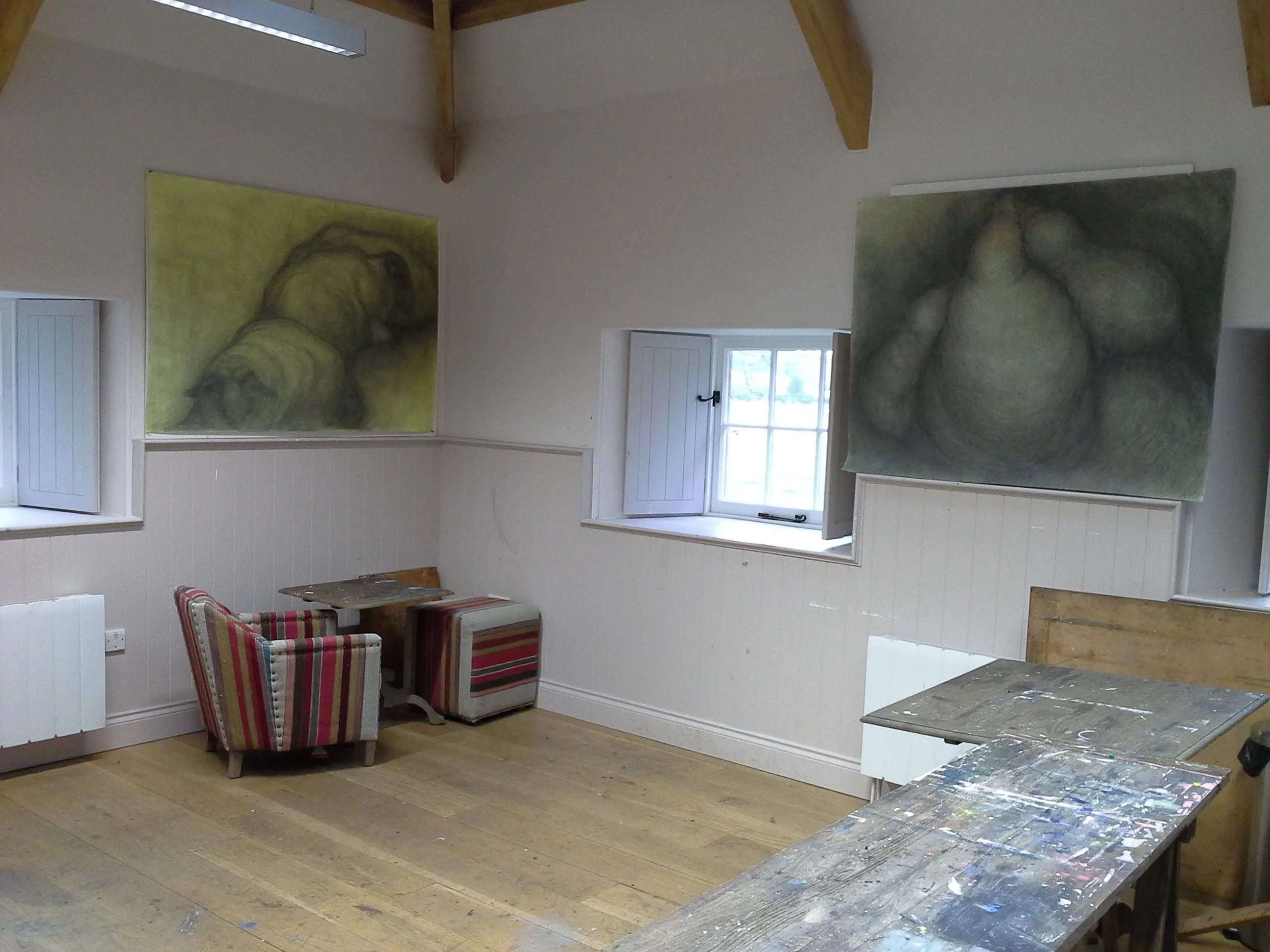 I was given the opportunity through the Art Students League and the Prince's Drawing School in London to spend a month in Scotland at Dumfries House. Dumfries House is a 2000 acres estate about an hour south of Glasgow that includes an 18th century mansion with a large collection of Chippendale furniture, artists studios, a farm, a training center in traditional crafts for young people and a variety of gardens. It allowed me to focus on drawing, working from nature, mostly from sheep and trees. My goal was to make abstract compositions based on my observations, but my fascination for my models and my efforts to understand their shape led me to work in a more figurative way than usual.